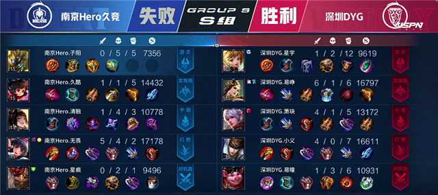 双方平稳开局。2分26秒镜拿下暴君。2分40秒中路团战,周瑜拿下一血。4分10秒裴擒虎在上路被击杀。4分20秒南京Hero久竞推掉下路一塔。4分35秒野区团战,南京Hero久竞打出0换2。5分30秒镜拿下主宰。6分40秒伽罗推掉上路一塔。7分钟镜拿下暴君。8分20秒南京Hero久竞推掉中路一塔,盾山被击杀。8分41秒南京Hero久竞推掉下路二塔。9分40秒南京Hero久竞强推上路二塔,团战南京Hero久竞打出0换2。10分25秒镜拿下暴君。11分50秒南京Hero久竞推掉中路二塔。12分钟镜拿下主宰。13分钟南京Hero久竞强推下路高地塔,团战打出1换2。南京Hero久竞顺势进攻水晶,13分39秒南京Hero久竞团灭深圳DYG推掉水晶追平比分。