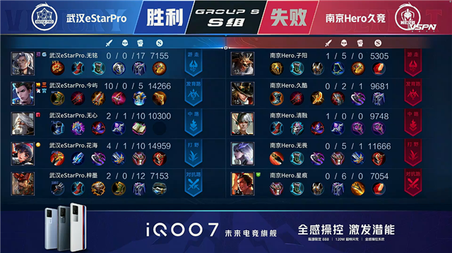 开局南京Hero入侵野区未果。1分24秒武汉ES入侵野区张飞抢到红BUFF。3分04秒武汉ES抢到暴君。4分16秒野区团战武汉ES打出0换2,关羽拿到一血。5分10秒武汉ES中路击杀裴擒虎。5分40秒武汉ES上路击杀张良。5分53秒武汉ES摧毁敌方下路外塔。6分36秒武汉ES拿下主宰。8分31秒武汉ES拿下暴君。8分41秒南京Hero野区击杀张飞。8分55秒南京Hero摧毁敌方中路外塔,随后暴君处击杀关羽。9分19秒南京Hero摧毁敌方下路外塔。9分38秒武汉ES摧毁敌方上路外塔。9分52秒武汉ES野区击杀蒙恬。10分25秒武汉ES拿下暗影暴君。11分28秒上路团战南京Hero打出0换2。11分55秒南京Hero摧毁敌方上路二塔。12分10秒南京Hero拿下暗影主宰。13分13秒南京Hero摧毁敌方下路二塔。13分19秒南京Hero摧毁敌方中路二塔。14分51秒武汉ES抢到暗影暴君,南京Hero团战击杀伽罗。15分47秒南京Hero摧毁敌方中路高地塔。16分28秒南京Hero拿下暗影主宰。17分15秒南京Hero野区击杀关羽。17分22秒南京Hero摧毁敌方下路高地塔。17分42秒南京Hero摧毁敌方水晶拿下比赛。