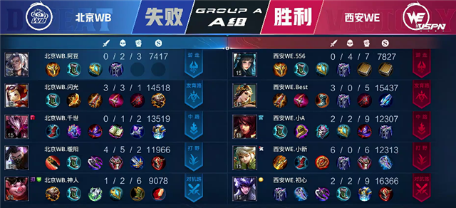 双方平稳开局。56秒马超拿下一血。2分20秒北京WB拿下暴君。2分57秒周瑜在上河道被击杀。3分40秒上路团战,北京WB打出0换2。4分15秒兰陵王拿下主宰。5分钟兰陵王越塔击杀马超。5分46秒西安WE推掉上路一塔,同时鲁班七号推掉下路一塔。5分51秒中路团战,兰陵王被击杀,西安WE推掉中路一塔。6分30秒西施在下河道被击杀。6分49秒鲁班七号拿下暴君。8分钟鲁班七号推掉上路一塔。8分30秒阿古朵拿下主宰。9分57秒河道团战,西安WE打出0换2,阿古朵拿下双杀。10分36秒西安WE拿下暴君。12分20秒下路团战,西安WE打出2换3,阿古朵拿下双杀。13分钟西安WE下路二塔被破。17分20秒野区团战,兰陵王被击杀。17分40秒西安WE推掉中路二塔。17分55秒虞姬拿下暴君。18分10秒野区团战,鲁班七号被击杀。19分20秒西安WE拿下主宰。20分钟中路团战,西安WE打出1换4,阿古朵拿下双杀。21分钟西安WE强推水晶率先拿到赛点。