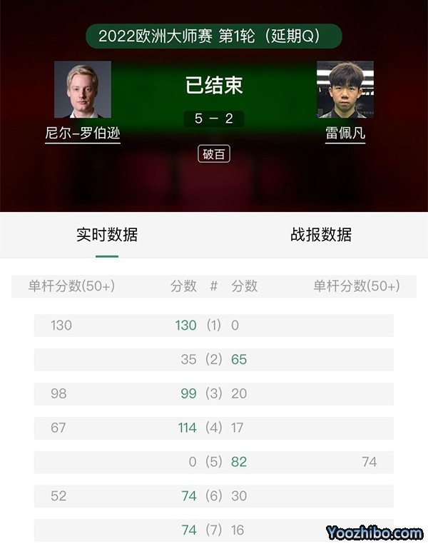 24直播网讯 2022年2月22日凌晨,2022斯诺克欧洲大师赛延期资格赛,中国2003年出生的小将雷佩凡挑战尼尔-罗伯逊,最终,尼尔-罗伯逊以5-2获胜,晋级到了正赛。两人交手记录来到了1比1。