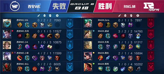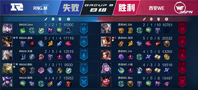 双方和平开局。1分钟下河道交火,镜拿下一血。1分20秒娜可露露入侵野区,镜被击杀。2分10秒RNG.M拿下暴君。3分40秒RNG.M拿下主宰。4分钟下路团战,镜拿下三杀,团战西安WE打出1换3。5分20秒娜可露露反下蓝Buff。5分40秒RNG.M越塔强杀白起,双方互换边路一塔。6分30秒RNG.M拿下暴君。6分50秒虞姬推掉下路一塔。8分10秒RNG.M推掉上路二塔。9分08秒RNG.M拿下主宰。10分钟RNG.M推掉中路一塔。10分20秒娜可露露拿下暴君。11分11秒西安WE中路二塔被破。12分钟RNG.M拿下主宰。14分35秒娜可露露拿下暴君。15分14秒RNG.M推掉上路高地塔。16分40秒娜可露露拿下主宰。17分44秒RNG.M推掉中路高地塔,盾山被击杀。17分56秒RNG.M攻破水晶拿下本场比赛胜利。
