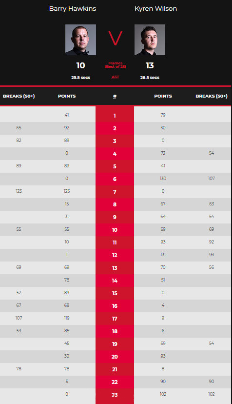 第21局,威尔逊单杆8分,打带防不进,霍金斯单杆78分拿下。霍金斯10-11。第22局,威尔逊没有贴到红球堆,霍金斯打进红球,进攻绿球不进;威尔逊单杆90分拿下。威尔逊12-10赛点。第23局,威尔逊单杆102分拿下比赛。