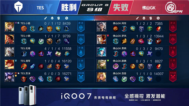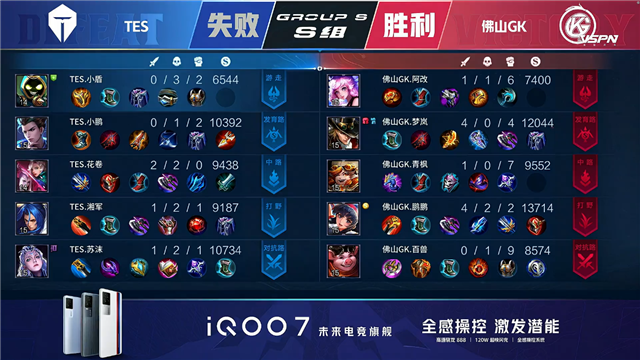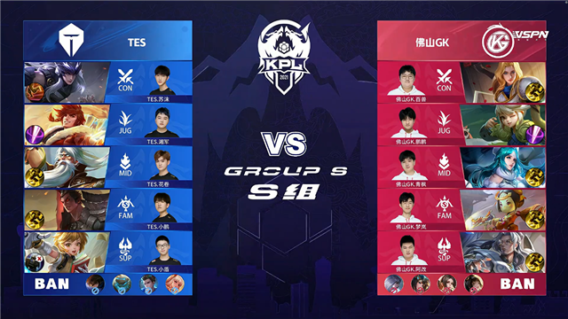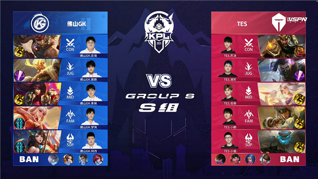 开局TES狄仁杰抢中线。47秒佛山GK反掉红BUFF并反掉红隼。1分59秒双方上路1换1,佛山GK拿到一血。2分08秒TES下路击杀瑶。5分15秒佛山GK拿下主宰,TES摧毁敌方下路外塔。5分48秒TES下路元歌单杀娜可露露。6分41秒TES拿下暴君。7分12秒佛山GK中路击杀娜可露露。7分51秒中路团战佛山GK打出0换2。9分03秒佛山GK中路击杀太乙真人。10分21秒TES拿下暗影主宰。12分28秒佛山GK摧毁敌方下路二塔。12分44秒佛山GK下路击杀太乙真人。13分48秒TES上路击杀娜可露露。14分57秒佛山GK拿下暗影暴君。15分10秒佛山GK下路击杀露娜。15分38秒中路团战佛山GK打出0换3。15分56秒佛山GK摧毁敌方水晶拿下比赛。