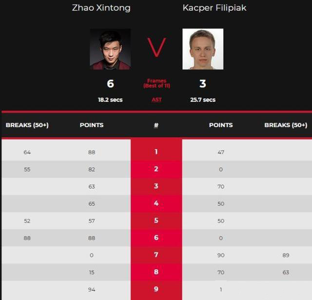 比赛开始赵心童打出单杆64分、55分连赢两局,第三局,菲利皮亚克70-63扳回一局,比分追成2-1。第四局到第六局,赵心童又打出两杆50+(52分、88分),比分优势扩大到5-1,赢得四个赛点。