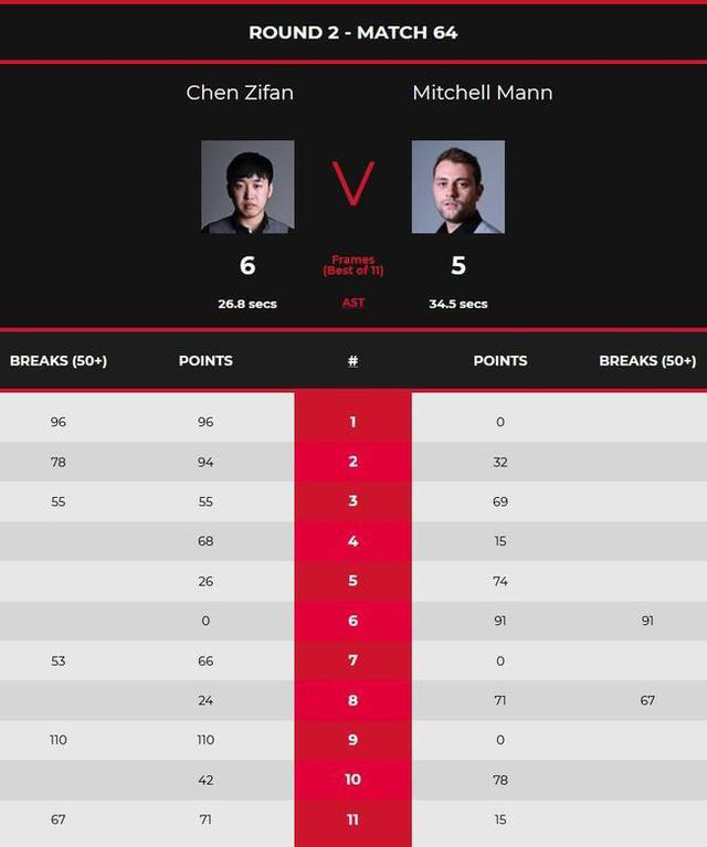 第8局,米切尔-曼轰出单杆67分,以71-24扳成4-4;第9局,陈子凡轰出本场双方唯一一杆单杆破百(110分),以110-0拿到赛点,第10局,米切尔-曼通过多次上手,以78-42将比赛拖进决胜局。