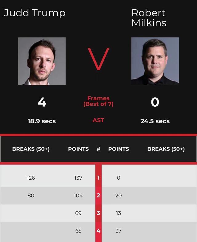 第四局,特鲁姆普沉底,母球K到红球堆留下机会,米尔金斯单杆32分防守;防守比拼,特鲁姆普打带防上手,单杆15分防守;特鲁姆普单杆15分,拼中袋红球不进;特鲁姆普运气球打进红球,贴到红球后防守;米尔金斯解球,特鲁姆普中袋上手,单杆21分防守;特鲁姆普单杆13分摔袋,65-37,台面18分,米尔金斯继续努力随后认输。