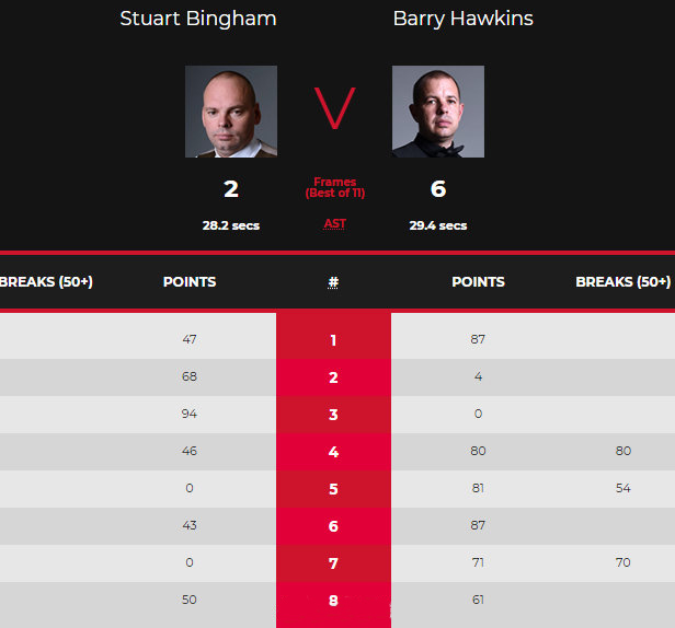 随后的一局中,宾汉姆回球漏出机会,霍金斯稳住心神上手以单杆70+再胜一局,并且到达赛点。最后一局中霍金斯率先上手,但是在领先的情况下发生失误,不过手感冰凉的宾汉姆没能抓住机会,再次上场的霍金斯扔掉玻璃心属性稳健地完成了超分,最终以6:2比分大胜宾汉姆,成为第一位闯进半决赛的选手。