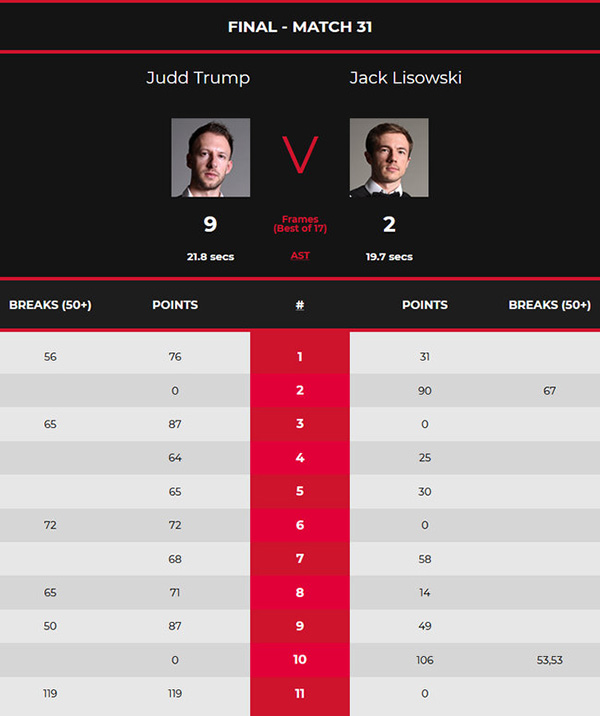 在双方上半场比赛中,首局比赛中利索夫斯基打进一杆长台上手,围球连得23分后底袋黑球不进,此后特鲁姆普拿下56分后中断在最后一颗贴库红球。利索夫斯基拼进红球后,进入清彩阶段黄球失误,特鲁姆普拿下这局1-0领先。第2局中利索夫斯基又率先上手,围球连得23分后转入防守,此后利索夫斯基又推进一杆长台,围球连得67分超分拿下这局,总分来到1-1平。