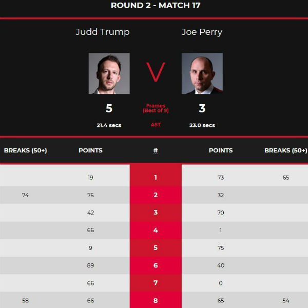 第一局,特鲁姆普单杆6分,特鲁姆普单杆13分粉球失误,乔-佩里单杆65分超分,乔-佩里抓住机会单杆8分拿下第一局。第二局,特鲁姆普单杆74分超分,结果摔袋;乔-佩里单杆追回28分,特鲁姆普打进红球拿下第二局。双方1-1。