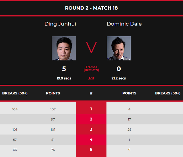 首局开打,丁俊晖状态不错,他轰出单杆104分,以107-4先拔头筹。整个第一局打得轻松愉快,丁俊晖似乎并没有发出全力。到了第二局,两人稍作防守后,戴尔这边出现致命失误,丁俊晖没有浪费这次机会,97-17取得总局分2-0的领先。