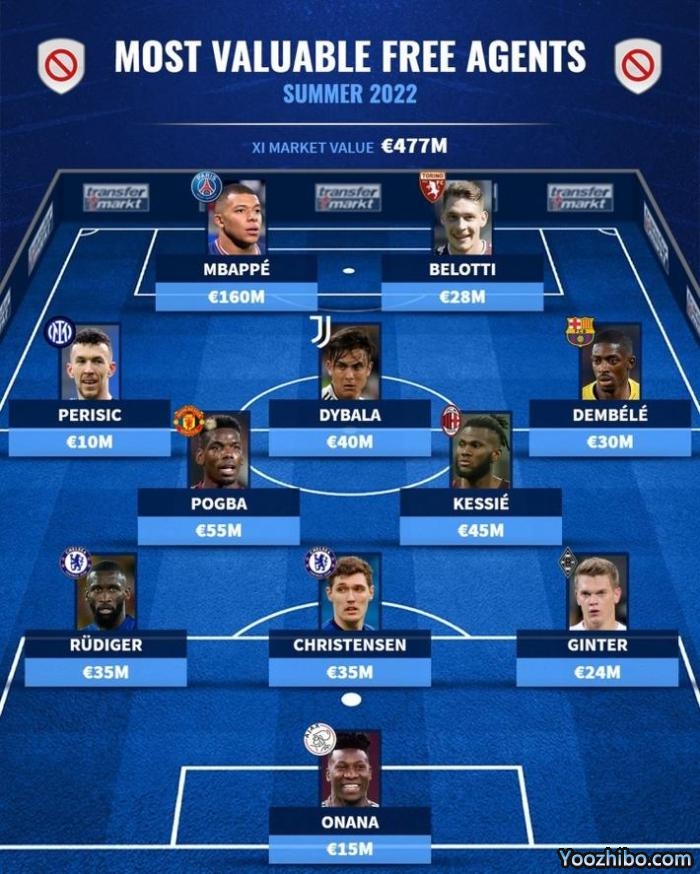 24直播网03月29日讯 德国转会市场今日统计了合同年球员最贵阵容,姆巴佩、博格巴和迪巴拉均在其中。