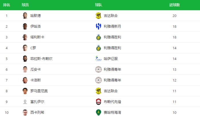 射手榜层面,吉达联合的前中超外援哈默德以20球傲视群雄,他斩获联赛金靴的可能性非常大。伊哈洛和塔利斯卡都是18球,当然在接下来的两轮联赛也有逆袭的机会。C罗14球想要翻盘夺得金靴,除非接下来连续戴帽、大四喜。